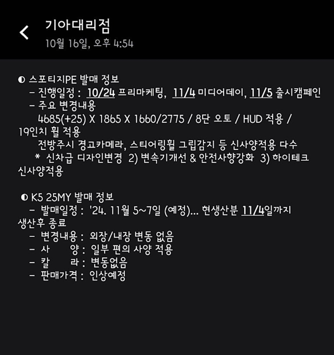 기아대리점에서 스포티지 PE 발매정보를 보내왔는데 10/24 프리마케팅, 11/4 미디어데이, 11/5 출시캠페인의 일정으로 진행이 된다고 합니다. 주요변경 내용 또한 알려주었는데 차크기가 4,685 x 1,865 x 1660 / 축거 2,775 와 8단 오토가 들어간다는 내용입니다. 전장이 4,660에서 25mm 더 커져서 4,685mm 가 되었습니다.