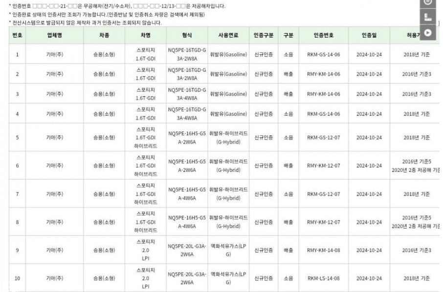이러한 정보는 환경부에서 조회되는 기아 스포티지 차량의 형식이 2w8a로 표기가 되어있는것을 볼수 있다며 환경부 인증 오피셜이라고 정보가 돌고 있습니다. 차량이 출시하기 전에 환경부에 인증을 받아야 하기 때문에 이러한 정보를 보아 미리 예상할 수 있다고 합니다.