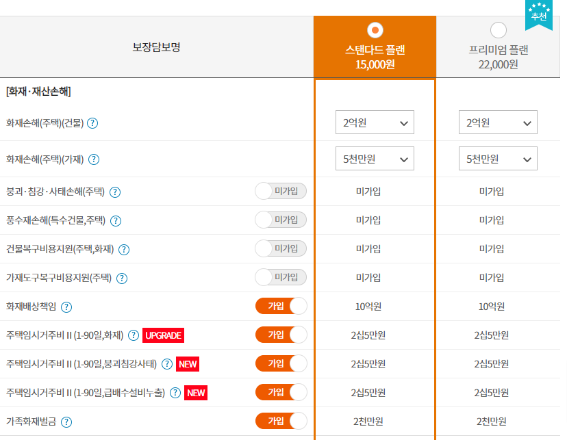 스탠다드 플랜으로 설정하면 1만5천원으로 화재손해 2억원에 가재도구 5천만원 등으로 설계가 가능합니다.