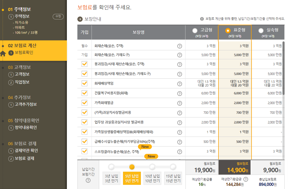 실손형은 8천8백원, 표준형인 화재손해 3억원, 가재도구 5천만원, 주택 급배수 시설 누출손해 5백만원을 포함하면 1만 4천원 정도의 월납입금으로 설계할 수 있습니다.
