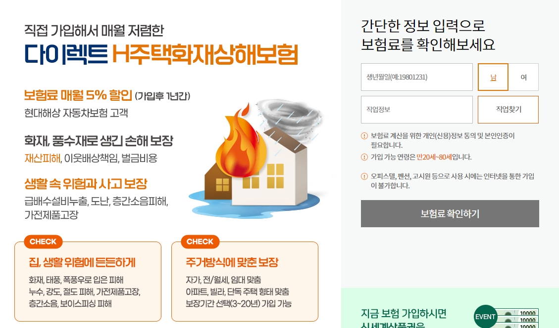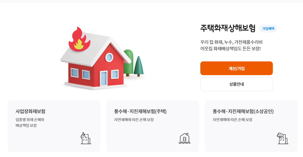 다이렉트 온라인 가입이 가능한 보험사 사이트에 들어가면 재산/화재 보험을 선택할수 있습니다. 클릭하여 들어가면 주택화재상해보험에 대한 설명이 나오고 주요보장인 우리집 화재, 누수, 가전제품 수리비, 이웃집 화재배상책임을 보장할수 있다는 내용이 나옵니다. 계산을 시작해 봅니다.