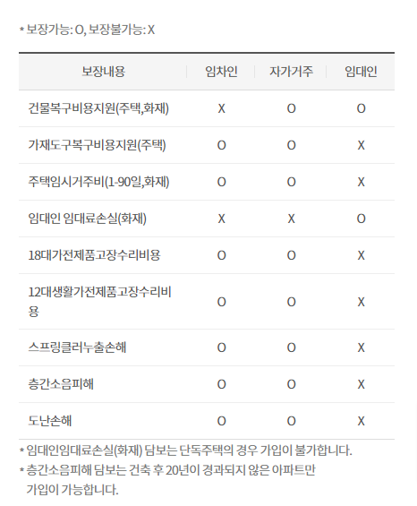 가입자가 임차인인지, 자가거주인지, 임대인인지에 따라 보장가능한 내역이 있습니다. 임차인은 건물복구비용은 보장이 불가능하고 임대인은 가재도구복구비용이나 주택임시거주비 보장 등을 받을 수 없습니다. 자가거주인 경우에는 문제가 없지만 임차인이거나 임대인 이면 임차인과 임대인이 모두 보험에 가입해야 모든 보장을 받을 수 있습니다.