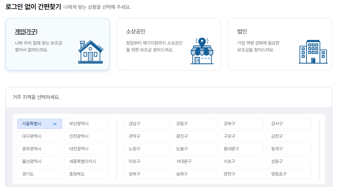 개인 / 소상공인 / 법인 세가지 카테고리가 있으니 본인에 맞는 것을 선택해서 내게 맞는 지원금을 찾아볼 수 있습니다.