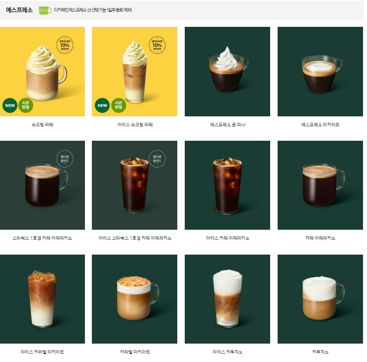 스타벅스 디카페인 1+1 이벤트의 대상은 총 5종인데 디카페인 카페 아메리카노, 디카페인 카페라떼, 디카페인 플랫화이트, 디카페인 캐러맬 마키아또, 디카페인 스타벅스 돌체라떼 이다.